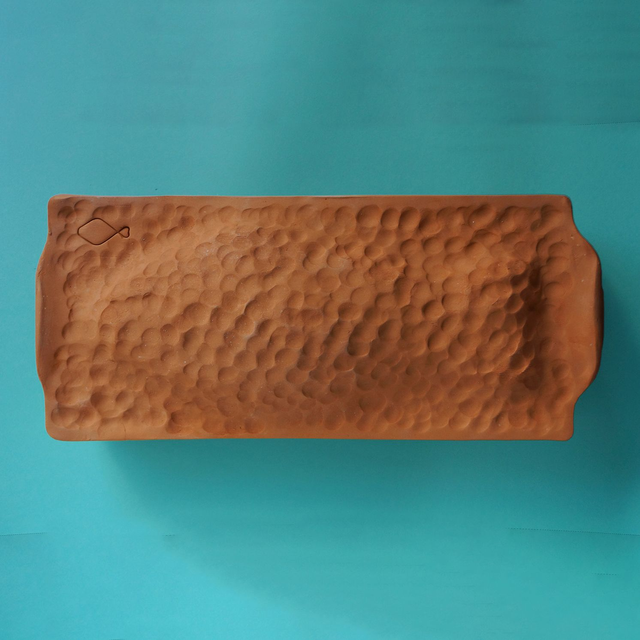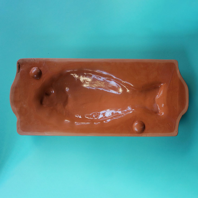 Il y a dans la cuisine occidentale tout un tas de plats zoomorphes ou aspergeophiles, dont les formes épousent, décrivent, ou rappellent celle d’un animal ou végétal - à la cuisson duquel ils servent parfois. Les plats à couvercle de cette famille font un peu semblant d’être une coquille, cosse ou gangue, dont tout naturellement sortira le fruit de leur travail. Rien de moins naturel, cependant : les poissons ne poussent pas sous terre. J’apprécie le surréalisme de ces ustensiles, auquel je voulais contribuer une chemise de terre pour poisson de moyen gabarit.