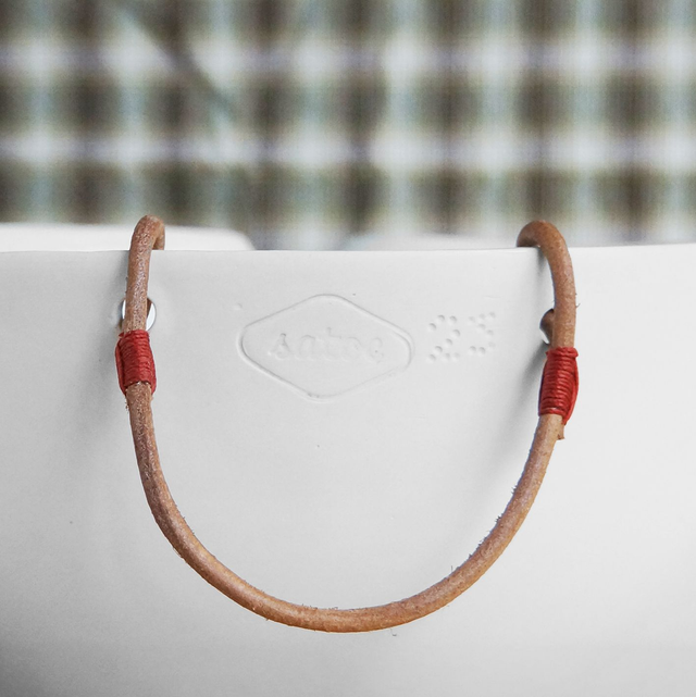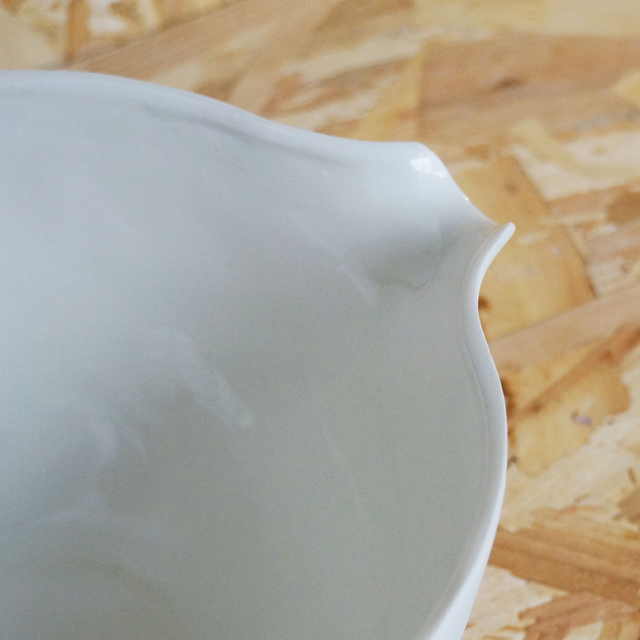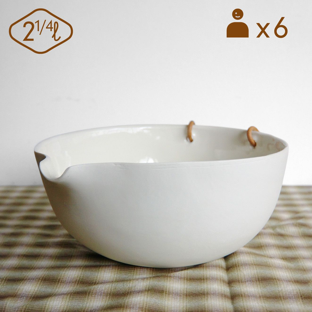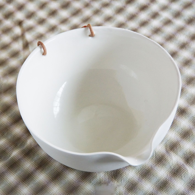 Porcelaine coulée, émail (interne), anse en cuir
