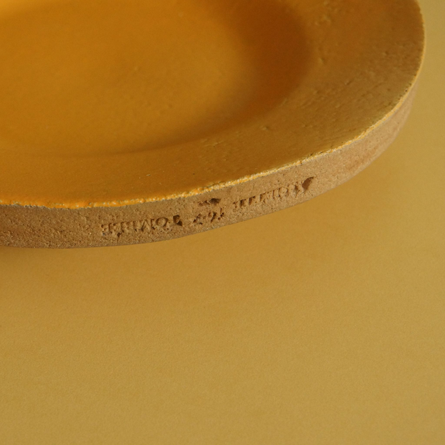 Le résultat est une assiette de cuisson en grès très, très épaisse, qui peut être chauffée au four et utilisée sur la table comme une mini-plancha individuelle. Je la « fabrique » en laissant tomber une plaque de grès d'une hauteur de 2 mètres sur un moule en bosse, afin de façonner et de comprimer la terre d'un seul mouvement.